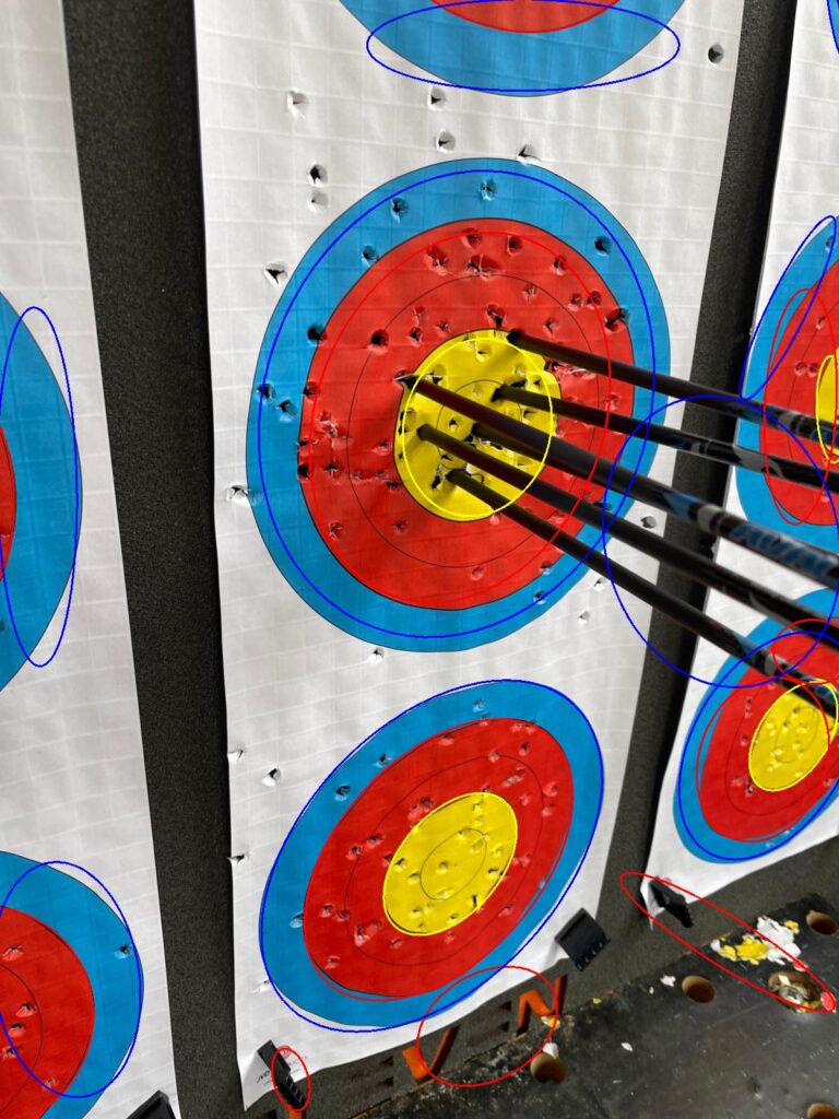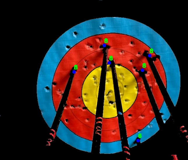 Ein Freund von mir ist hobbymäßig Bogenschütze. Er fragte mich, ob ich nicht eine App schreiben kann, so dass er mit dem Handy ein Bild von der Zielscheibe machen kann und automatisch daraus erkannt wird, welche Pfeile wo getroffen haben, und wie viele Punkte er damit bekäme. Hier ist der aktuelle Stand: